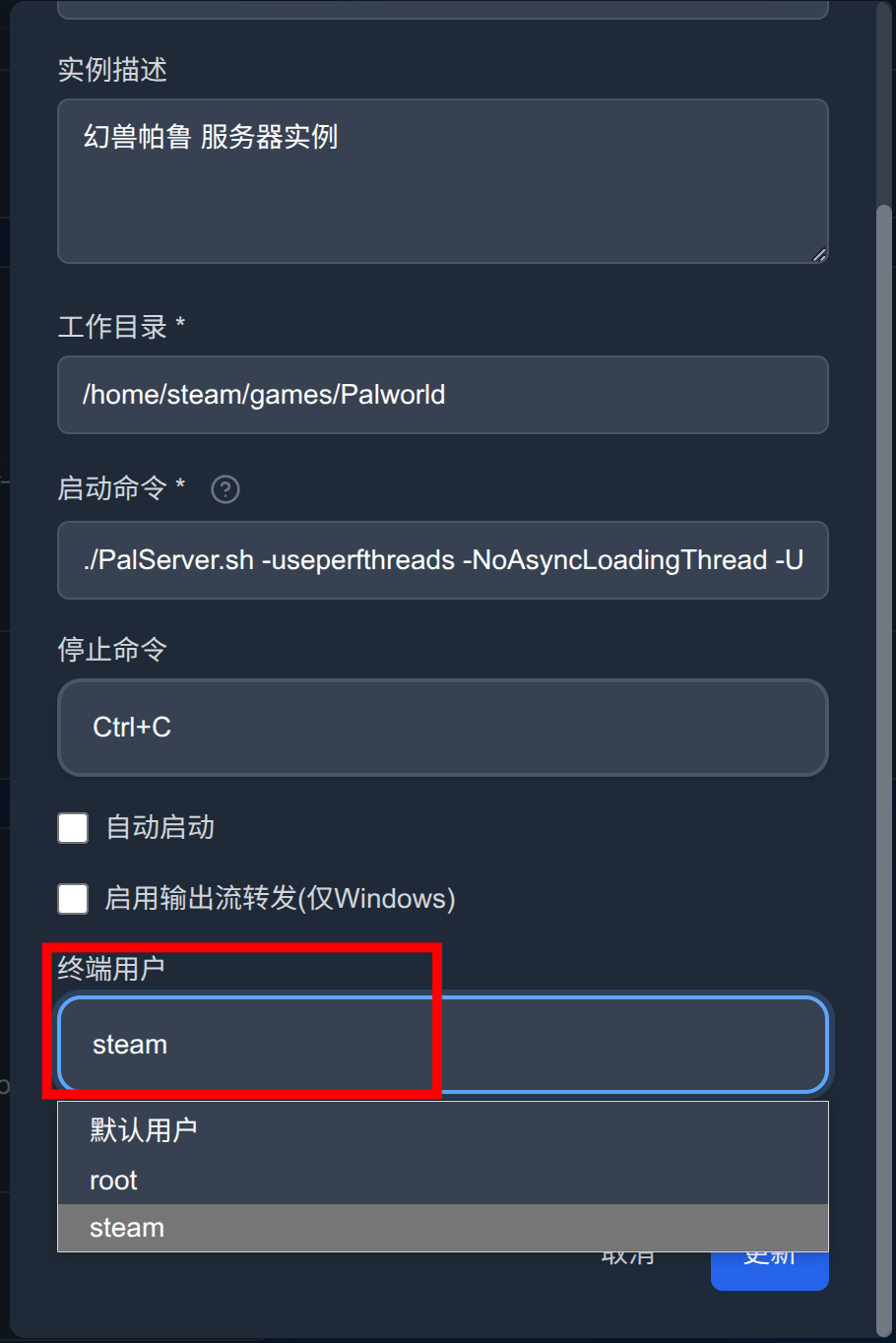 部分游戏不支持root直接启动,若您是3.8.0版本及以上可以从实例管理中针对幻兽帕鲁单台实例设置以steam用户运行