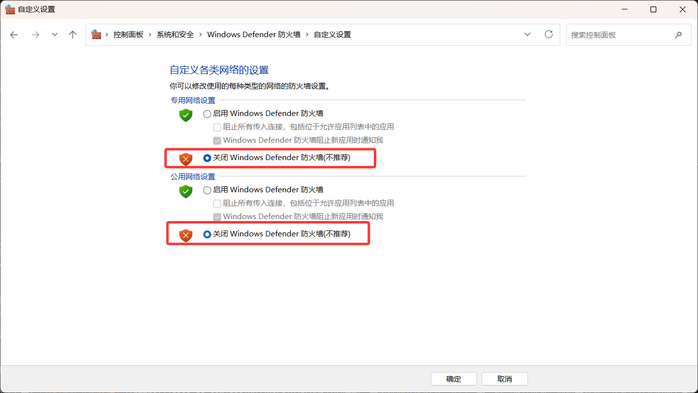 - 一般是由于您的网络端口或防护墙问题,若您是通过Windows部署,请关闭系统防火墙(控制面板-Windows Defender 防火墙-启用或关闭Windows Defender 防火墙(在左侧)全部将其勾选关闭保存即可)